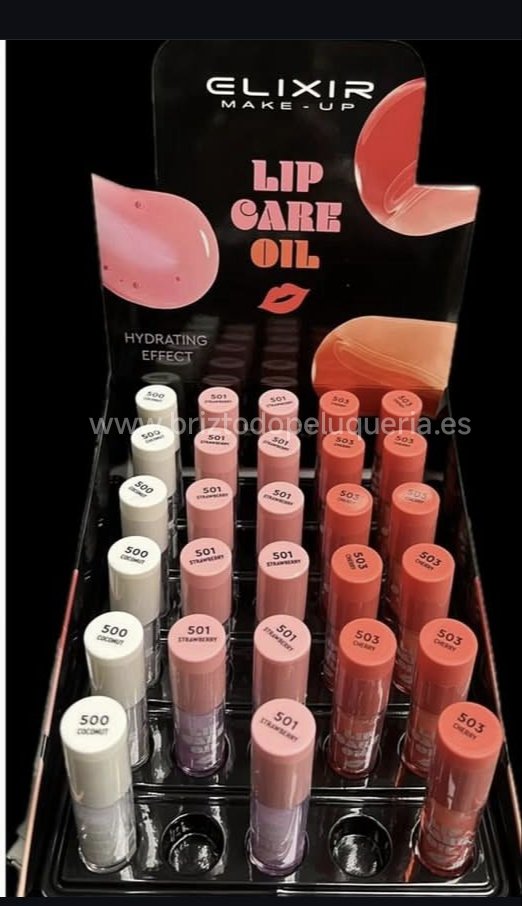 EXPOSITOR DE ACEITE PARA CUIDADO DE LABIOS Lip Care Oil ELIXIR MAKE UP, incluye: